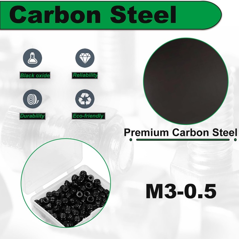 • Premium Carbon Steel: Our M3-0.5 hex nuts is made of good quality Carbon Steel, can provides strength and great protection; Due to the black oxide finish these nuts have a thin oil coating to prevent rusting