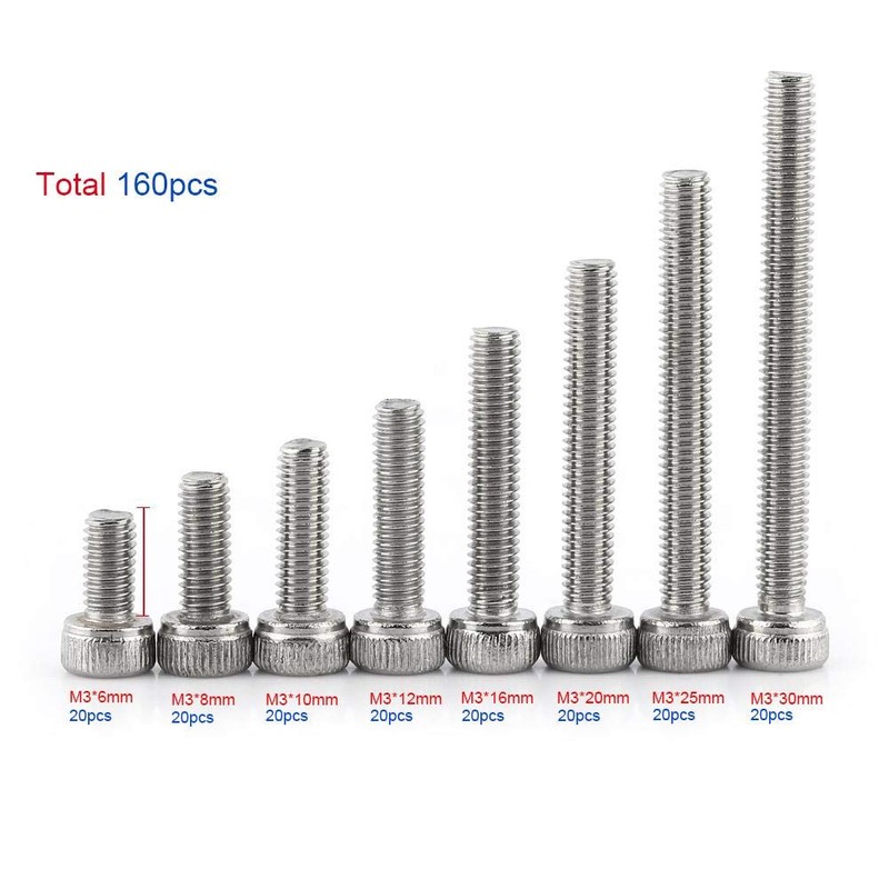 M3 Hex Socket Cap Head Screws Bolts, 160pcs 304 Stainless Steel Metric Thread Hex Socket Bolts Assortment Kit, Used In Home and Office Appliance, Machinery, Furniture, Repair