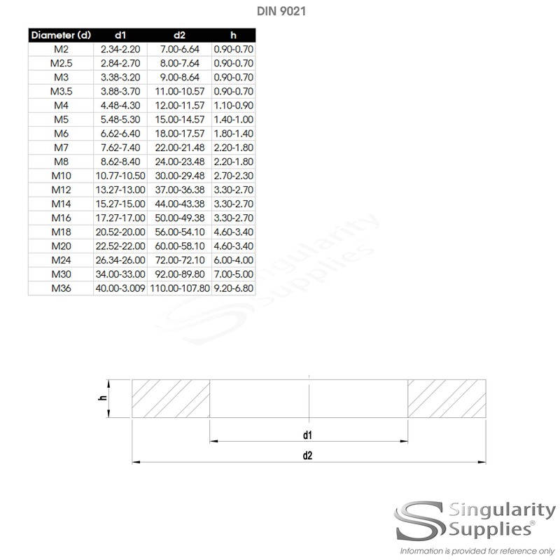 M4 (4mm) Flat Washer (Form G) - Stainless Steel (A2) (Pack of 20): A flat washer with a standard central hole, used to spread the load on surfaces fastened with screwed fixings. Tensile Strength: 140HV Size: M4 Inner Diameter: 4.3mm Outer Diameter: 12mm Thickness: 1mm DIN: 9021 UNI: 6593 ANSI/ASME: B18.22M