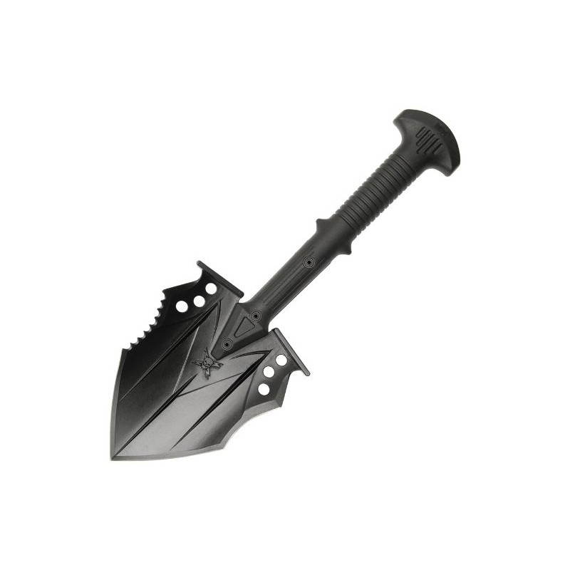 - The shovel point edge is sharpened, with a partially serrated edge on one side, and a concave chopping edge on the other.