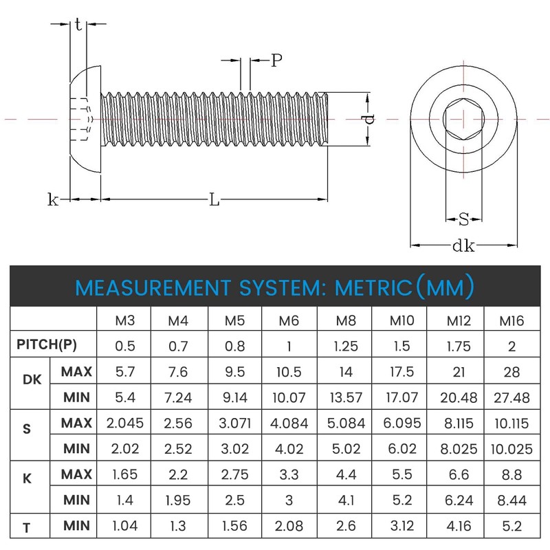 - The Button Head Socket Cap Screws thread diameter: 5mm; Thread pitch size: 0.8mm; Total Length (Do not Include head): 16mm; Head Diameter: 9.14-9.5mm;