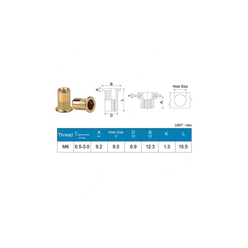 • Rivet Nuts Total Length: 15.5mm / 0.610"; Application Hole Size: 0.351"-0.356". More detail of M6 metric size specification can be refer to the third image detail sheet.