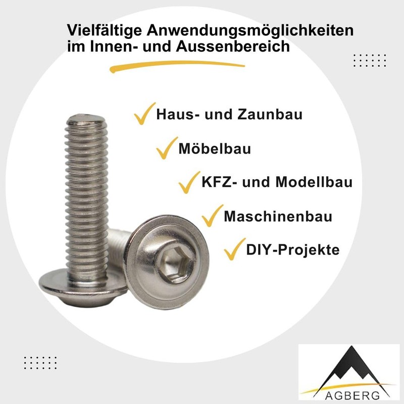 - These screws feature a flat round head that provides a larger contact surface and thus distributes the load. This makes them the ideal solution for anyone looking for a reliable and versatile screw. With their hexagon socket, these lens flange head screws are easy to install and remove. All you need is an Allen key - ideal for any DIY enthusiast and professional tradesman.