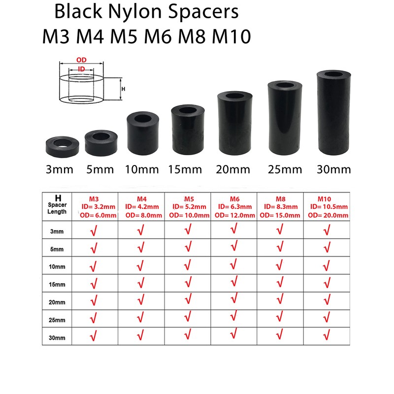 - M3 (ID=3.2mm, OD(D)=6.0mm), lengths(H): 3mm, 5mm, 10mm, 15mm, 20mm, 25mm and 30mmt