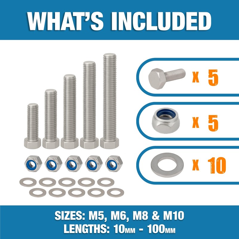 - M5 x mm HEX BOLTS – Includes bolts, nyloc nuts, and washers – Each pack contains 5 x hex head bolts, 5 x locking nuts, and 10 x Form A washers, all crafted from durable A2 stainless steel for long-lasting use and excellent corrosion resistance.