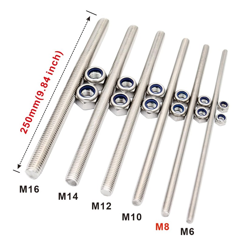 - [SIZE] Thread diameter M8x1.25mm; screw length 250mm (9.84"); thread pitch: 1.25mm; thread style: Right Hand. It can be drilled, cut, heated, and shaped.