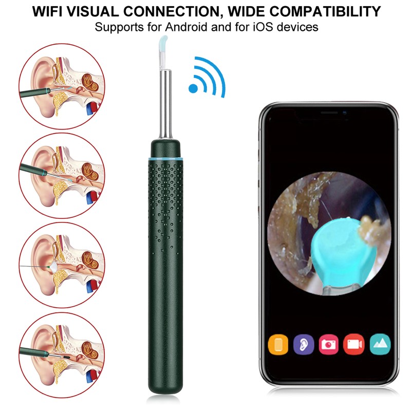 1、3MP FHD 3.5mm camera lens diameter, clear for the dark environment of the ear canal, the protection ring is used to protect the baby's ears. 2、Supports for Android and for iOS devices via WiFi, with a transmission distance of up to 10 meters/32.8 ft and a smooth transmission. 3、Also available on tablets, just download the app and connect to the WiFi of the endoscope , and one-key to start working. 4、6pcs cold LED lights can help you illuminate the canal and see the dark areas clearly, great for daily nursing cleaning, ear disease patients. 5、Equipped with a 4-axle gyroscope that provides smooth image transmission, making it easier to operate the otoscope. 6、Built-in temperature control system for a proper and constant temperature during use to provide a safe and comfortable environment for users. 7、Magnetic charging dock, USB quick charging, it only takes 1.5 hours for a full charge, and 18 days continuous using time for 5 minutes per day. 8、Not only for ear canal, but also the eardrum, the mouth, the gum, the throat, the nasal cavity, the hair roots of the scalp and the rest of the body that need inspection. 9、With 16 cleaning tools, the user-friendly design will help you remove earwax easily. It can help you relieve stress, increase sleep, protect your ears and protect your health.