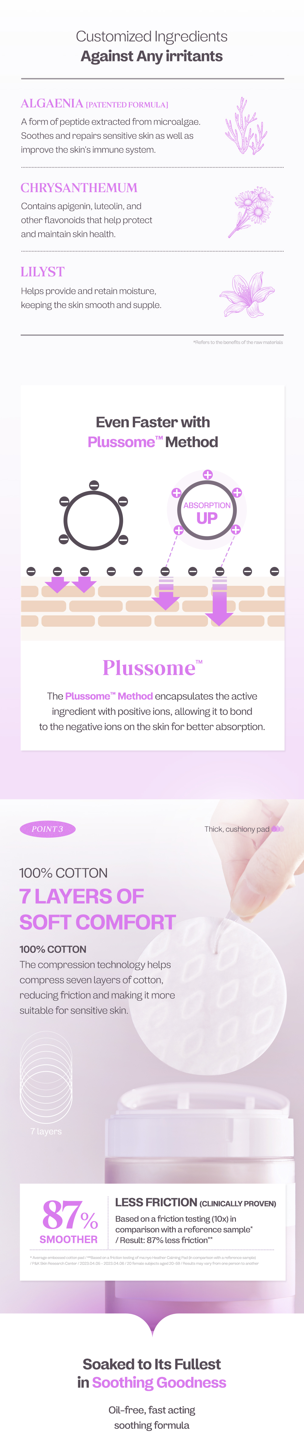 This Heather Calming Essence Pad is a go-to remedy for any types of skin irritation. It is for all types of sensitive skin, even hypersensitive ones. Its use can help reduce physical irritation by 70.89%, sunlight-induced irritation by 66.27%, heat irritation by 19.49%, irritation by drastic temperature change 31.5%, dryness irritation by 16.17%, physical irritation from wearing a face mask by 59.85%, heat irritation from wearing a face mask by 25.04%. It completed tests for the use for acne-prone skin, dermal irritation for sensitive skin, general skin irritation. 7 layers of 100% pure cotton fabric are compressed to provide gentle and soft use for sensitive skin. In-use tests for friction showed the product is 87% more gentle than other pad products. Its user reviews showed 100% positive comments about its softness, toning skin texture, soothing and reducing redness. 95% offered positive comments for repeat purchase. The pad effectively contains Heather’s active calming ingredient Rutin, by Aqua Grinding™ technology maximizes the effects of active ingredients. Patented PLISSOME™ technology quickly delivers a calming formula.