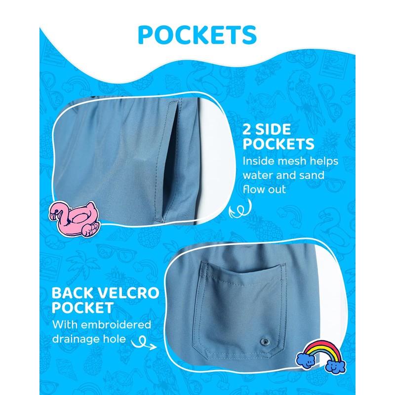 - 【Elastic Waistband】:Boys swim shorts feature elastic waistband and adjustable drawstring, adds to the comfort level and makes it easy to get the perfect fit. These swimming trunks have two side pockets with mesh interior and one back pocket with nicely embroidered drainage hole to let water out