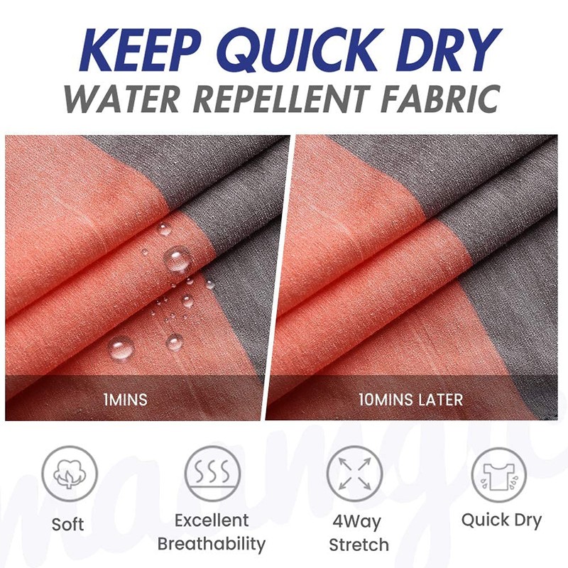 • Water-repellent and quick-drying (5-10 minutes), lightweight polyester fabric, due to water-repellent feature, it can easily get up from the water, dry quickly from the wet, suitable for all water sports or holiday beach activities.