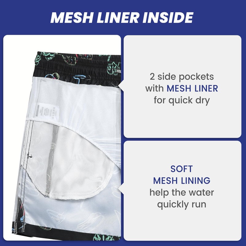 - Quick-Drying Swim Trunks - 100% polyester; made of quick-drying fabric that is lightweight, comfortable and extremely water-repellent (not waterproof). High quality printed men's swim trunks that will never fade or peel. Soft mesh lining allows for maximum breathability so the shorts don't swell underwater. You'll be completely dry within minutes of getting out of the pool or surfing.