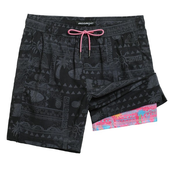maamgic Mens Swim Trunks 7" Swim Shorts with Compression Liner Quick Dry Swimming Trunks Plaid Grain Bathing Suit Balck-Palm Pineapple Medium