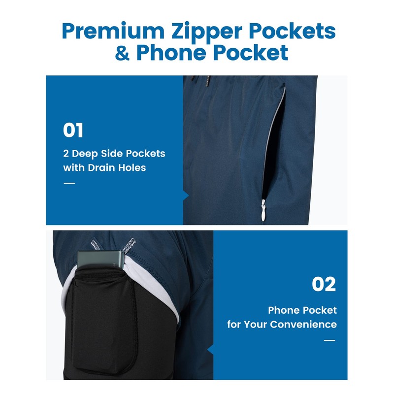 - Product Features - Easy pull-on elastic waistband and drawstring offer a comfortable, adjustable fit. Two deep side pockets with zippers that stuff doesn't fall out of, one zip back pocket with grommet to let water drain and one liner pocket to keep your phone in place.