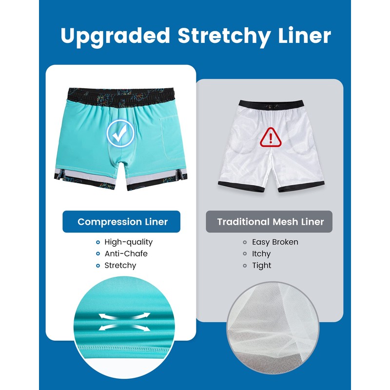 - No Mesh Liner Swim Trunks - Chafe-free boxer brief liner that’s soft and supportive for all day wear helps protect your private part more than traditional itchy mesh. The material is also exceptionally lightweight so you don’t need add any bulk underneath.