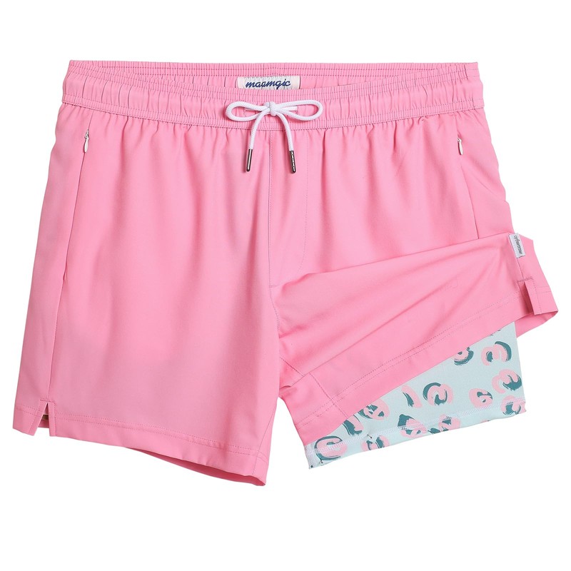 MaaMgic Mens Swim Trunks with Compression Liner 2 in 1 Swimming Shorts Stretch 5.5" Quick Dry Bathing Suits,Pink Leopard,Medium