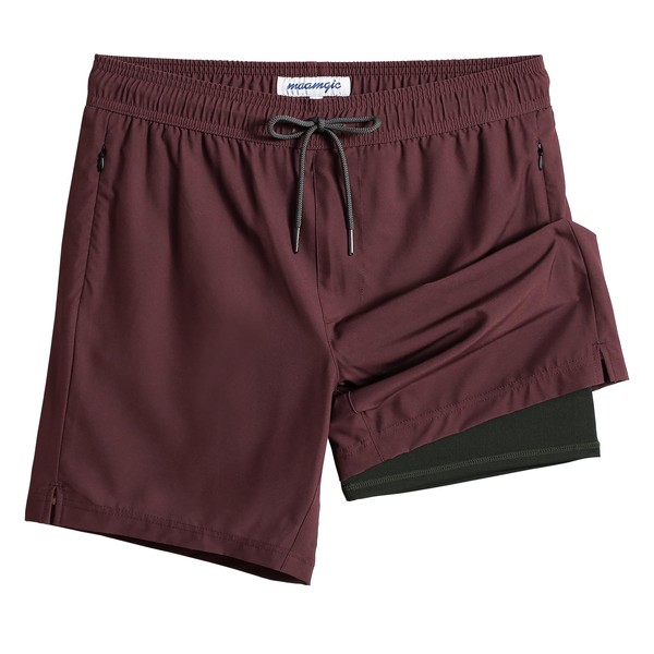 MaaMgic Mens Swimming Shorts with Compression Liner Men's Swim Trunks 2 in 1 Quick Dry Stretchy Board Shorts with Zipper Pockets Green-Wine