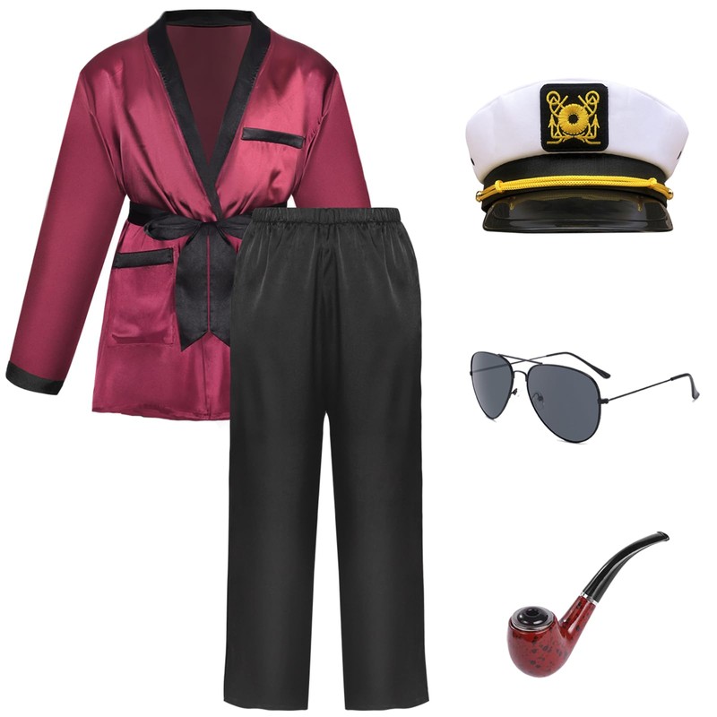 - What You'll Get: A dark red robe, a toy smoking pipe, a captain's hat, sunglasses, and a pair of black pants. The set is complete enough for you to utilize in dressing for everyday life scenarios or for role-playing parties