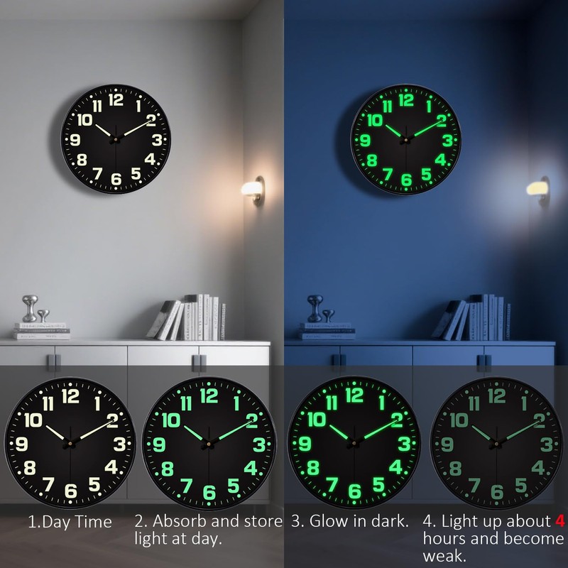 • ✨【Enchanted Glow in the Dark Wall Clock】Wander your moonlit home guided by our clock's soft aquamarine glow! By day, luminous wall clock hands and numbers absorb light; by night, they emit dreamy radiance like underwater starlight. Perfect for midnight feedings, dark hallway navigation, or admiring time from your pillow – no more blinding phone screens. This isn’t just visibility; it’s a soul-soothing experience that transforms time-telling into magic.