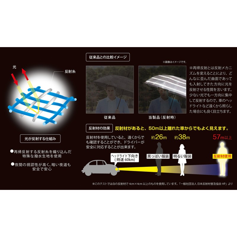 | Size: | 収納時全長:約24.5cm、親骨:55cm/6本骨、開いた直径:約97cm |