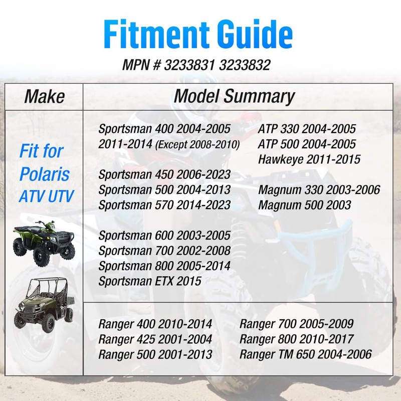 - 【Compatible Vehicle】 Fit for Polaris ATV/UTV ▶ Sportsman 400: 2004-2005 2011-2014 (Except 2008-2010) ▶ Sportsman 450: 2006-2023 ▶ Sportsman 500: 2004-2013 ▶ Sportsman 570: 2014-2023 ▶ Sportsman 600: 2003-2005 ▶ Sportsman 700: 2002-2008 ▶ Sportsman 800: 2005-2014 ▶ Sportsman ETX: 2015