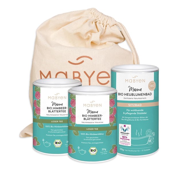 MABYEN Mama Birth Preparation Set with 2 x Raspberry Tea and 1 x Hay Flower Bath - 3 Products + Fabric Bag - Gift Set - Set for Pregnancy - Bath - Birth Preparation