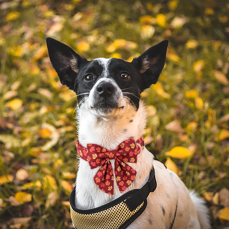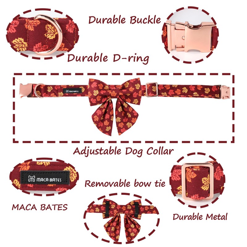 Maca Bates Fall Dog Collar with Sailor Bow Tie Autumn Maple Dogs Collars with Bowtie Adjustable Durable Soft Puppy Colar for Small Medium Large Girl Boy Male Female Pet with Metal Buckle