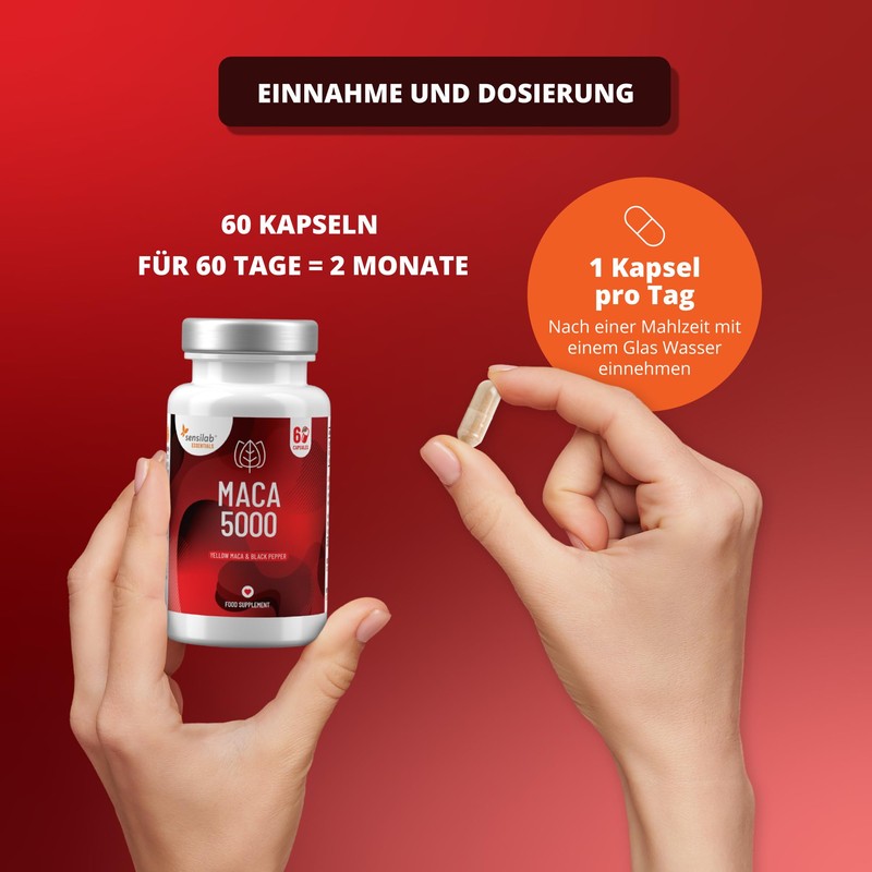 Maca Capsules - 10:1 High Dose: 500 mg Equivalent to 5000 mg Fresh Maca - 60 Capsules for 60 Days - Highly Bioavailable Maca Extract - Contains Piperine for Better Absorption - Sensilab