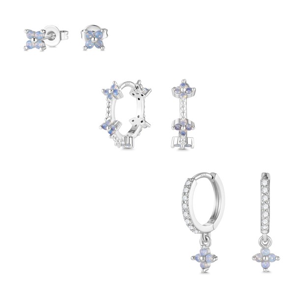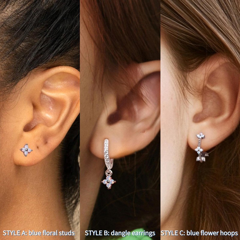 - 🌸Delicate flower design in blue🌸This set of sterling silver earrings presents a charming floral motif in blue - a fresh, elegant accent for your everyday style. Includes 3 pairs of earrings: minimalist flower studs, sparkling hoop earrings with flower and stylish drop earrings - perfect for combining and stacking