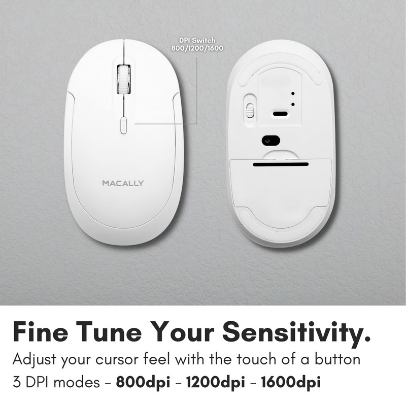 Macally - Ratón inalámbrico Bluetooth para Mac y PC, Botones de Clic silenciosos con Cuerpo Delgado y cómodo, ratón inalámbrico silencioso con dpi 800/1200/1600, Color Blanco