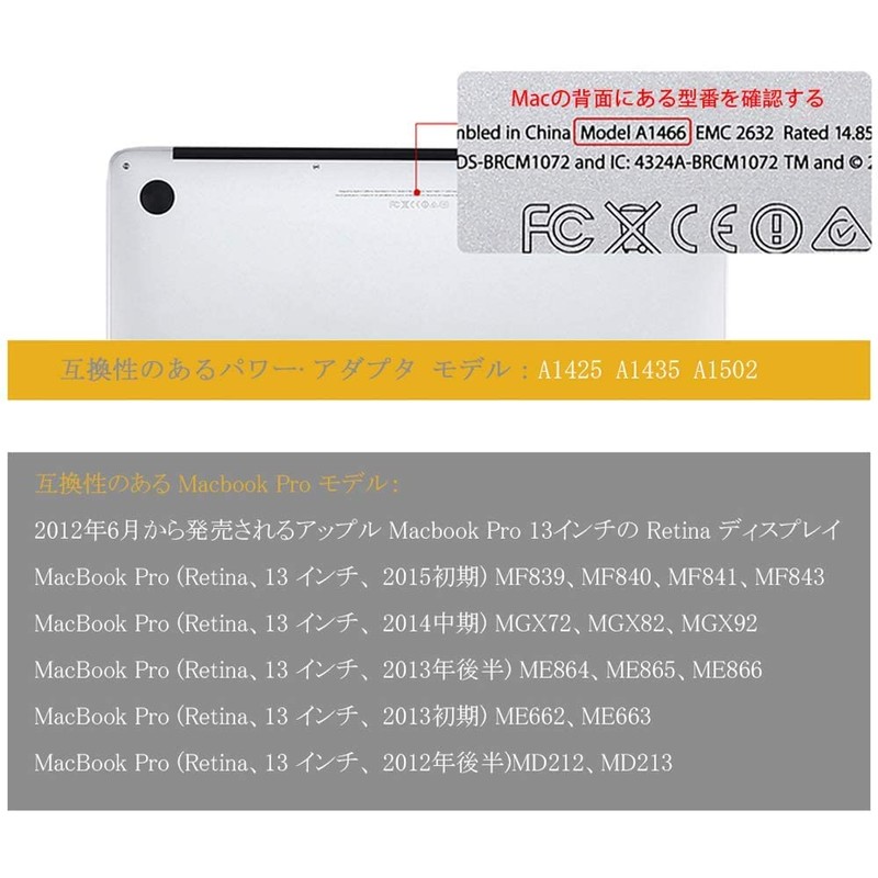 • 【60W 電源アダプタ】互換ACアダプタは2012 中期以降に発売されるアップルMacbook Pro/Air 13 インチに適用します。互換性のあるパワー·アダプタ モデル:A1425 A1435 A1502(注:ご注文の前に、ご利用の Macbook および電源アダプタのモデルをチェックしてください。)