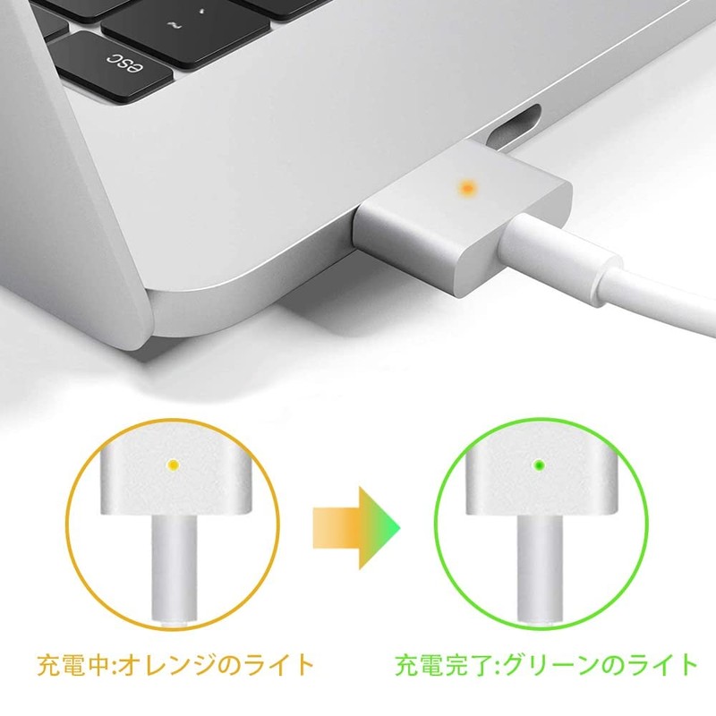• 【T型充電器】Macbook用互換電源アダプタの最大の特長は、磁気のDCコネクタです。磁気コネクタを使用すると、コードを無害に取り外すことが簡単にできます。万が一、つまずいた場合でも、MacBook Airは安全に置かれたままになり、ケーブルの擦り切れや劣化を防ぐことにも役立ちます。アダプタが完全に接続されると、DCコネクタの先端にある発光ダイオードが点灯します。オレンジのライトは充電中、グリーンのライトは充電完了を知らせます。