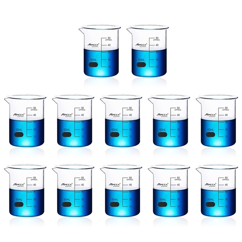 Maccx 1.7oz(50ml) Sturdy Glass Beaker, 3.3 Borosilicate Griffin Low Form with Printed Graduation, Pack of 12, BKL050-012
