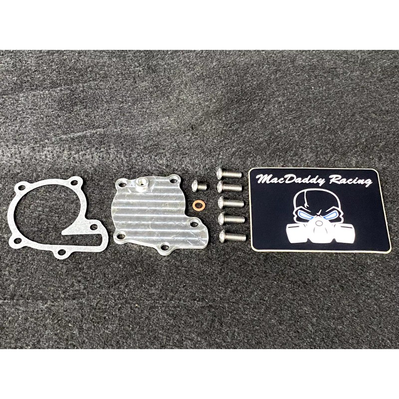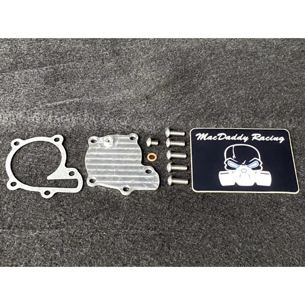 MacDaddy Racing billet coolant water pump cover EZ drain. This cover is cnc machined from billet aluminum. This replaces the oem steel cover and allows for easy drain of your coolant and looks great too. Comes with cover, stainless steel hardware, and cover gasket.