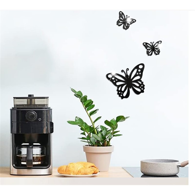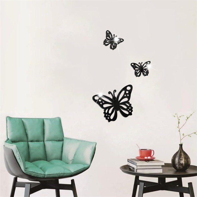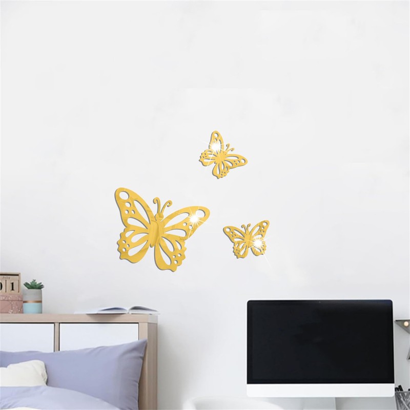 MACGIKMIRO 3 Pcs Butterfly Acrylic Wall Stickers Removable Adhesive Wall Mirror Decor for DIY Living Room Home Background (Gold)