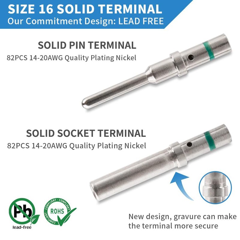 - [ DEUTSCH Size 16 Solid Contacts ]: You can get 82Pairs wider range terminals, Pin contact 0460-215-16141/ socket contact 0462-209-16141. What's more, we have developed crimp range of 16gauge terminal to its limit, can reach 14AWG-20AWG [0.5-2.0 mm²].