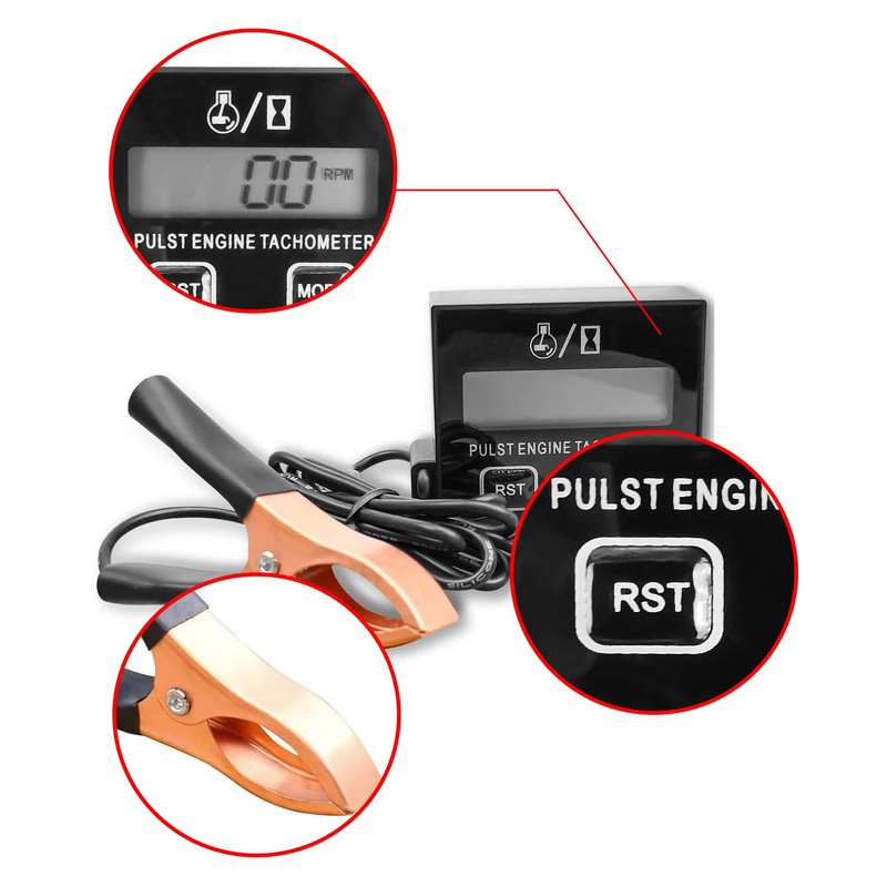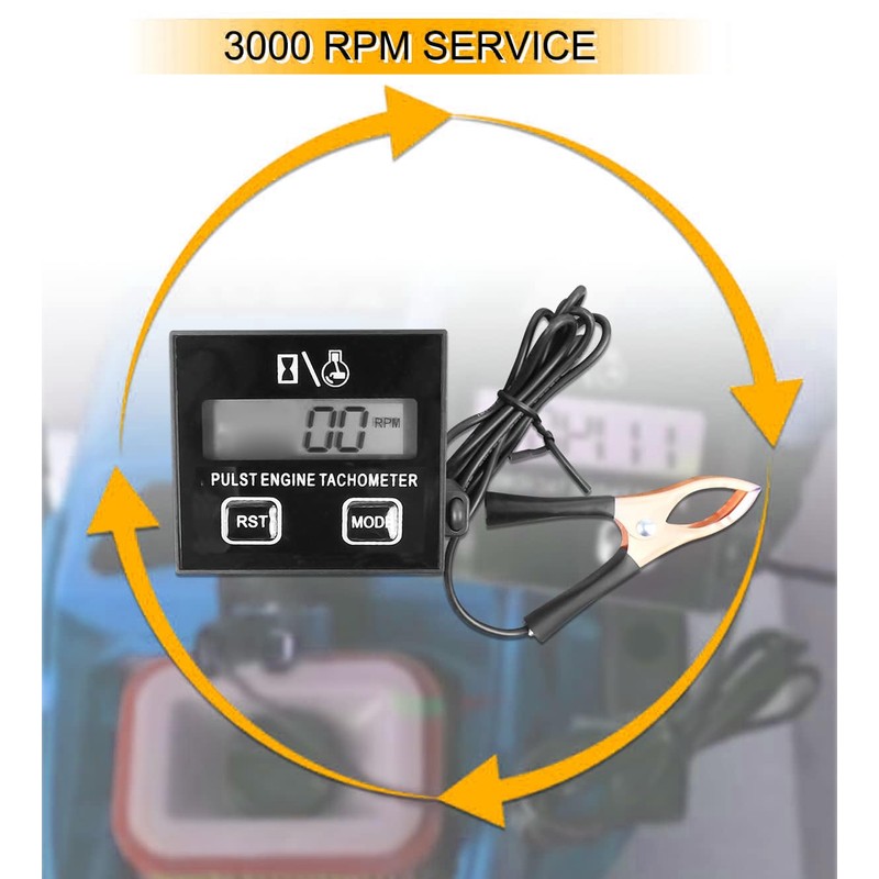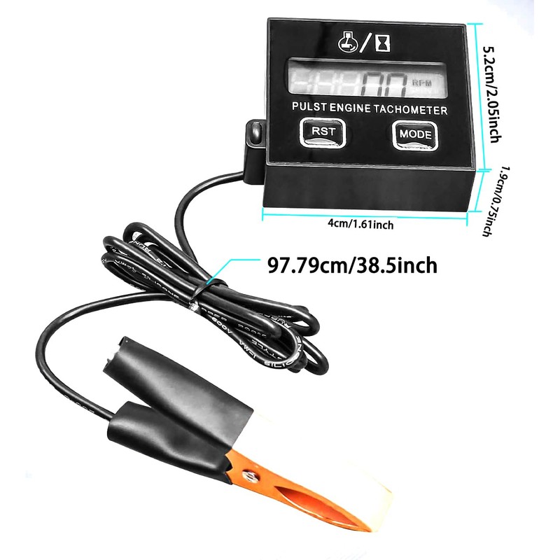 COMPATIBLE WITH A VARIETY OF DEVICES This digital chainsaw speedometer is perfect for lawn mowers, chainsaws, ATVs, UTV, ATVs, ATVs, boats, tractors and more. ACCURATE ROTATION SPEED MEASUREMENT Measure the RPM from 100 RPM to 30000 RPM, making it suitable for 2-stroke single cylinder, 4-stroke double cylinder and petrol engines that ignite once one revolution. Convenient Reset Function Easily reset the total hours and maintenance time by pressing the RST button for a long time. Easy Installation and Use The package includes a clip for easy testing by clamping the spark wire. The inductive design allows for a hand-held speedometer experience. Simply walk near the spark plug cable of the engine and keep a distance of 3-5 cm for accurate testing. Reliable Package You will get 1 x tachometer in the package.