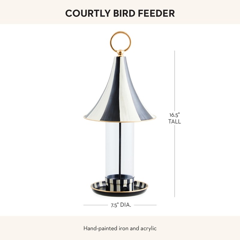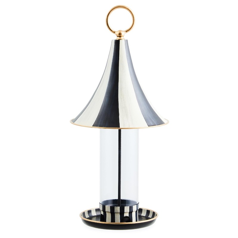 • ELEGANT OUTDOOR ACCENT: Bring unique hanging decor to your outdoor garden and a snack to the songbirds. The Courtly Bird Feeder features a black-and-white striped roof, a glass bird-feeder body, a small striped birdseed tray, and a gold ring hanger.