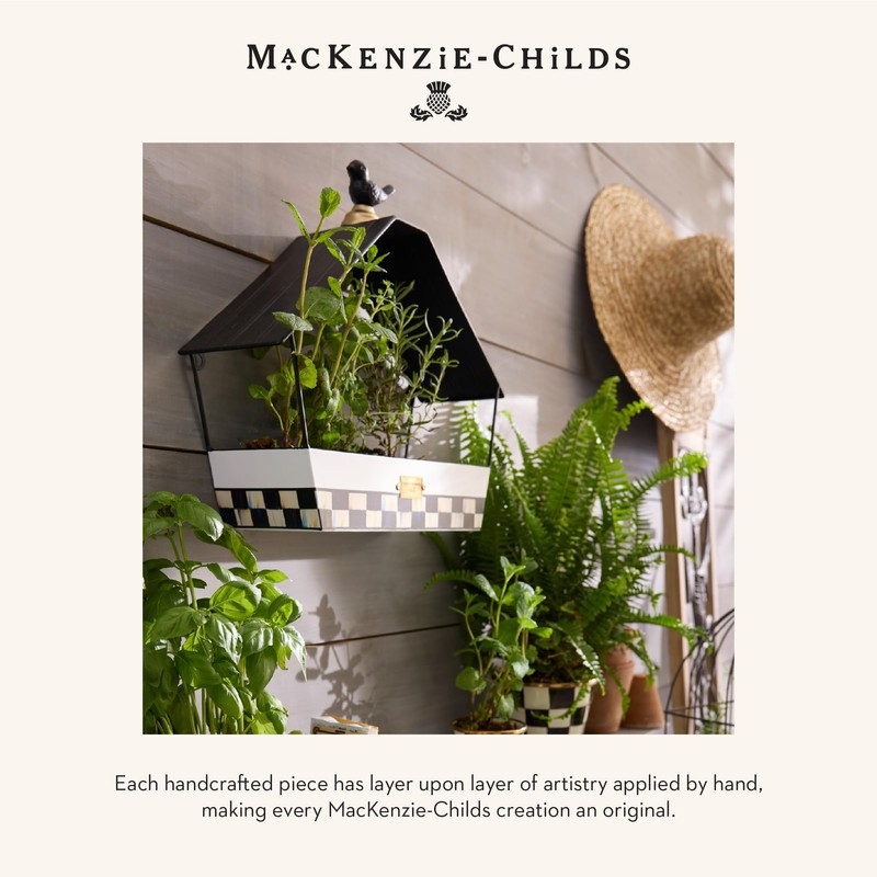 Deciding between birdhouse and bird feeder styles is no small feat, especially when every little perch has MacKenzie-Childs charm! This hand-painted metal bird feeder features a beautiful design that is great for accenting your spring patio or garden decor or for decorating your own nest indoors. Birds of a feather are sure to flock to the metal-and-glass bird feeder with a small tray on the bottom where the birds can perch and dispense the seed. It hangs from a golden ring on top, making it easy to install on any sturdy branch or holder. Group it with our other adorable birdhouses or bird decor, or pair it with matching MacKenzie-Childs garden decor and accessories to craft your ideal outdoor space!