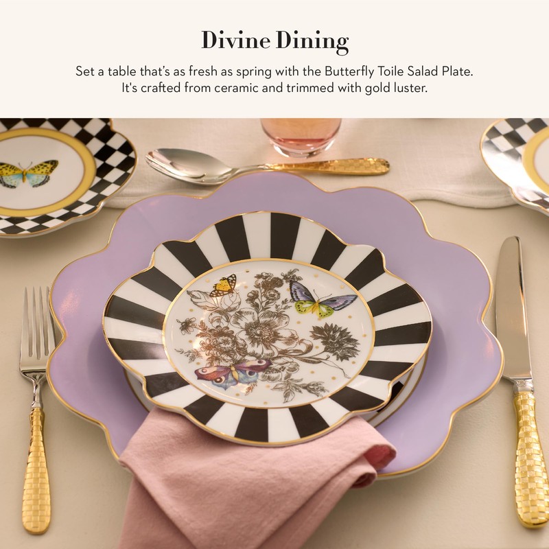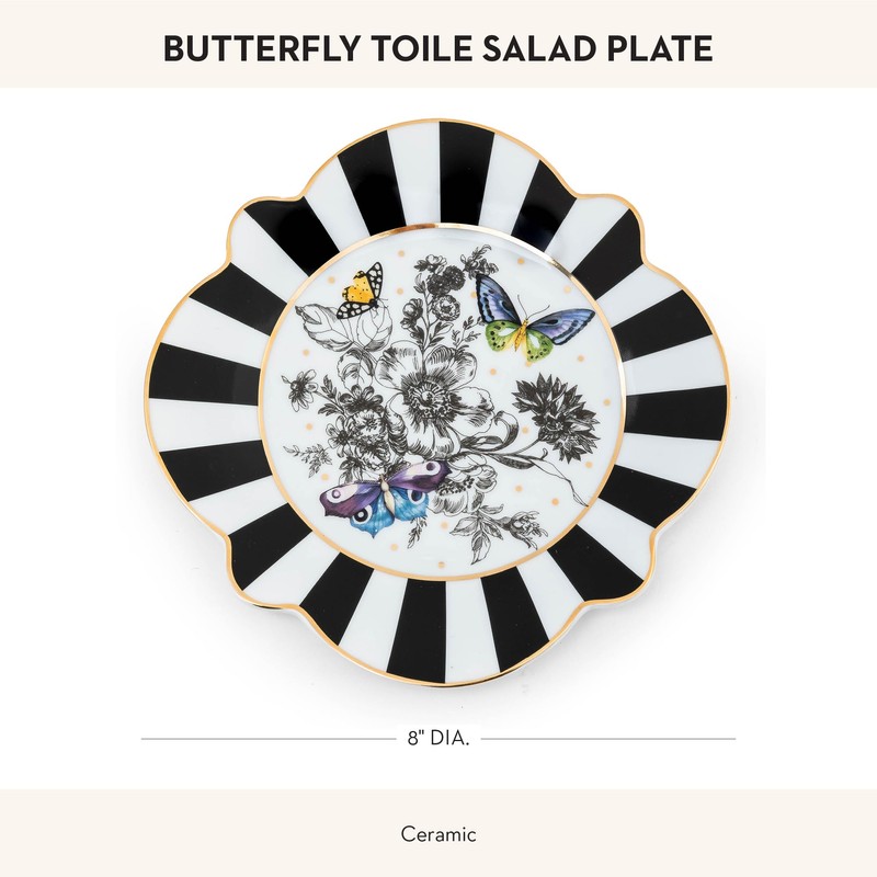 - ELEGANT SERVING ESSENTIAL: Let our Butterfly Toile Ceramic Salad and Dessert Plate set a table that’s as fresh as spring. This porcelain plate features a colorful butterfly toile pattern and is trimmed with black-and-white stripes and gold luster.