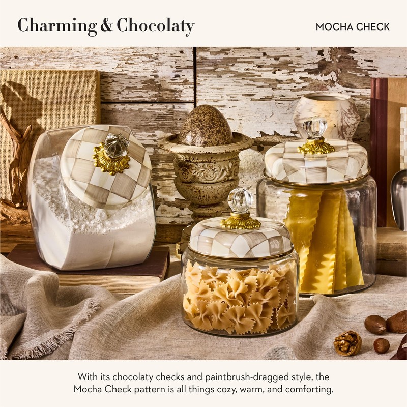 MACKENZIE-CHILDS Large Kitchen Canister, Decorative Glass Storage Jar with Lid, Brown-and-White Mocha Check