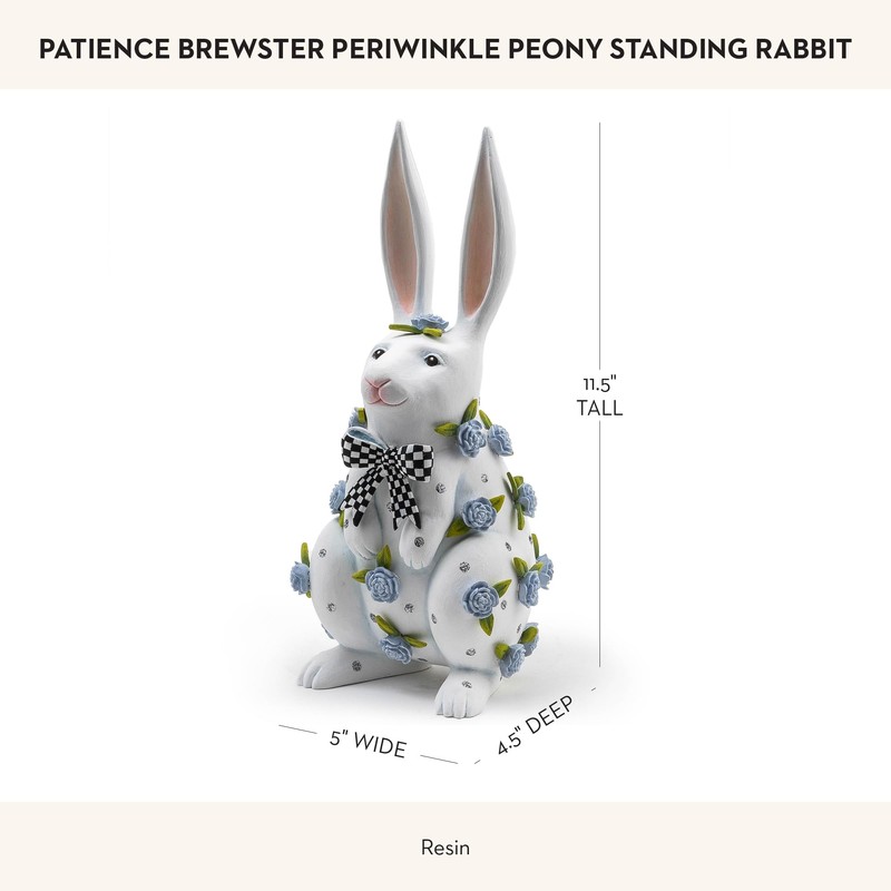 - ELEGANT SPRING DECOR: The Patience Brewster Periwinkle Peony Standing Rabbit statue features a white rabbit accented with raised periwinkle peony flowers and dots of silver glitter. It’s trimmed with a black-and-white check bow.