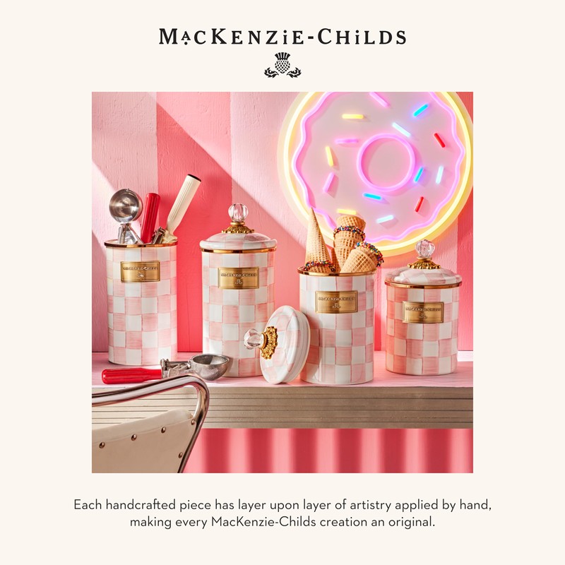 MACKENZIE-CHILDS Rosy Check Enamel Canister, Pink-and-White Kitchen Storage Container with Lid, Small
