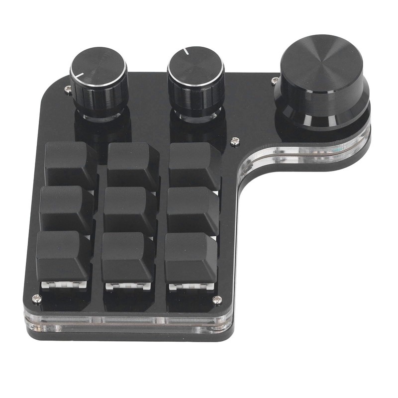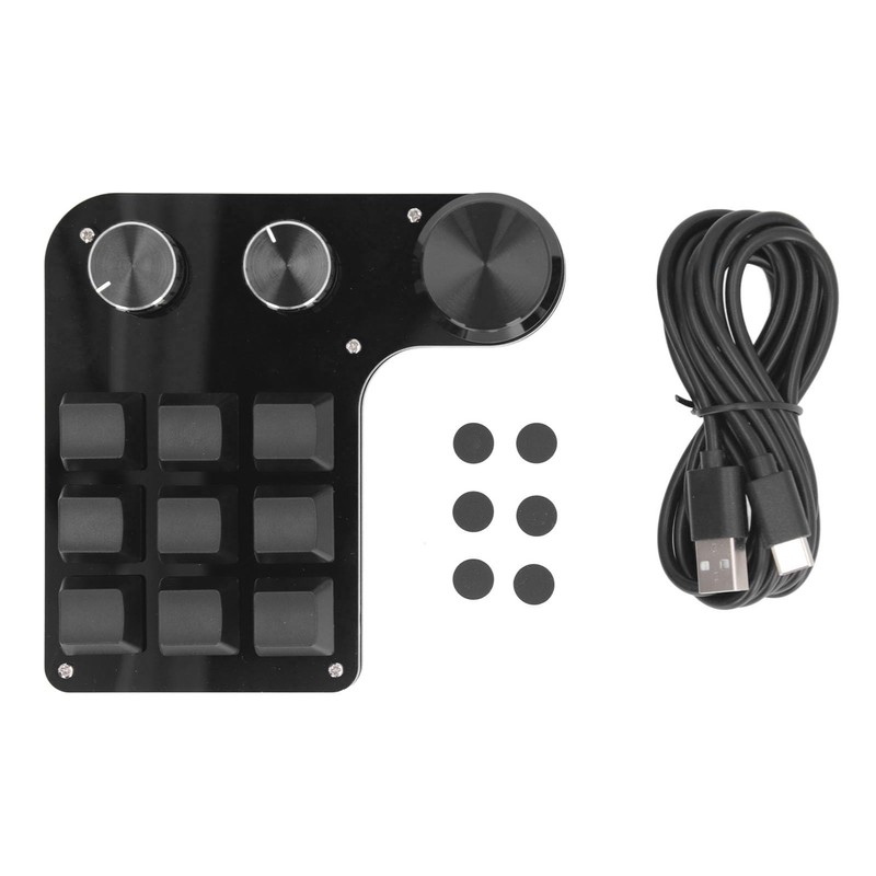 • Keypad Structure: Custom mini mechanical keypad with 9 keys and 3 control knobs, with red switch and RGB LED, supporting keypad programming macro and software.