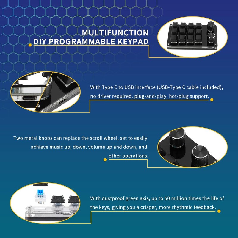 1、12 Keys 2 Knobs: Featuring 12 programmable keys and dual knobs, this wired mechanical gaming keyboard with red switch supports keyboard programming macros. 2、Knob Functions: Macro programmable keyboard knobs can be used for functions like zoom in or out, switch songs, volume adjustment, play or pause, and more. 3、Programming Capabilities: All keys on the mechanical keyboard can be programmed, enabling easy creation of complex shortcuts. Red switch for enhanced gaming experience. 4、Customizable Button Functions: Users can easily set button functions with a dedicated program that allows for repeatable settings, provide seamless device switching without reconfiguration. 5、Versatile Customization: 12 Key mechanical keyboard supports a variety of custom functions including zoom, shrink, copy, paste, select all, cut, gaming, office work, music, media, industrial control, and more.