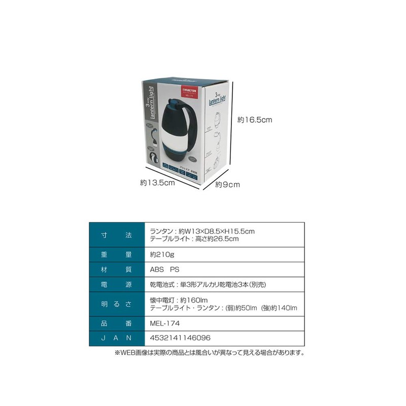 - 寸法 ランタン : 約W13×D8.5×H15.5cm。テーブルライト : 高さ約26.5cm。重量 約210g。材質 ABS PS。電源 乾電池式 : 単3形アルカリ乾電池3本(別売)。明るさ 懐中電灯 : 約160lm。テーブルライト・ランタン : (弱)約50lm (強)約140lm