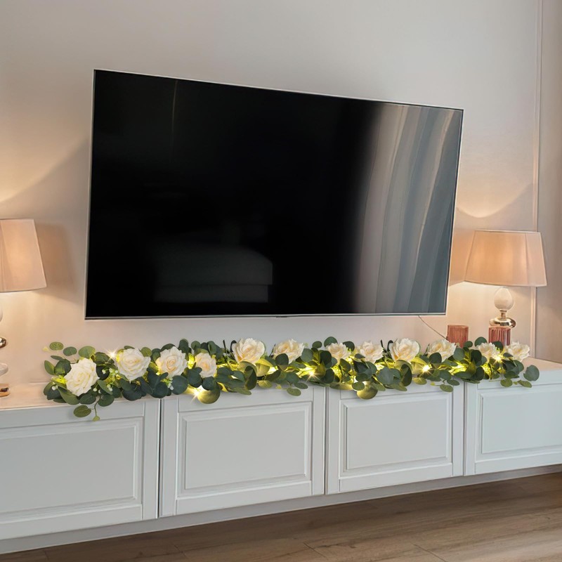 - Eucalyptus Garland with Built-in LED Lights: Transform any space into a magical setting with our 6.6FT eucalyptus garland, now upgraded with built-in led lights! Whether decorating a wedding arch, table centerpiece, fireplace mantel, backdrop, or outdoor garden fence, this rose flower garland brings timeless elegance and a touch of romance to any occasion. The versatile design allows for endless creative possibilities, making it perfect for weddings, Valentines Day, Mothers Day or seasonal celebrations