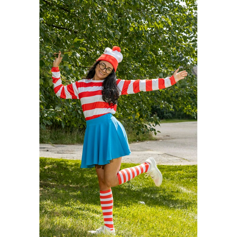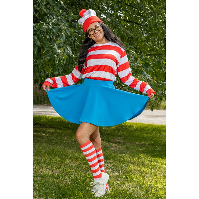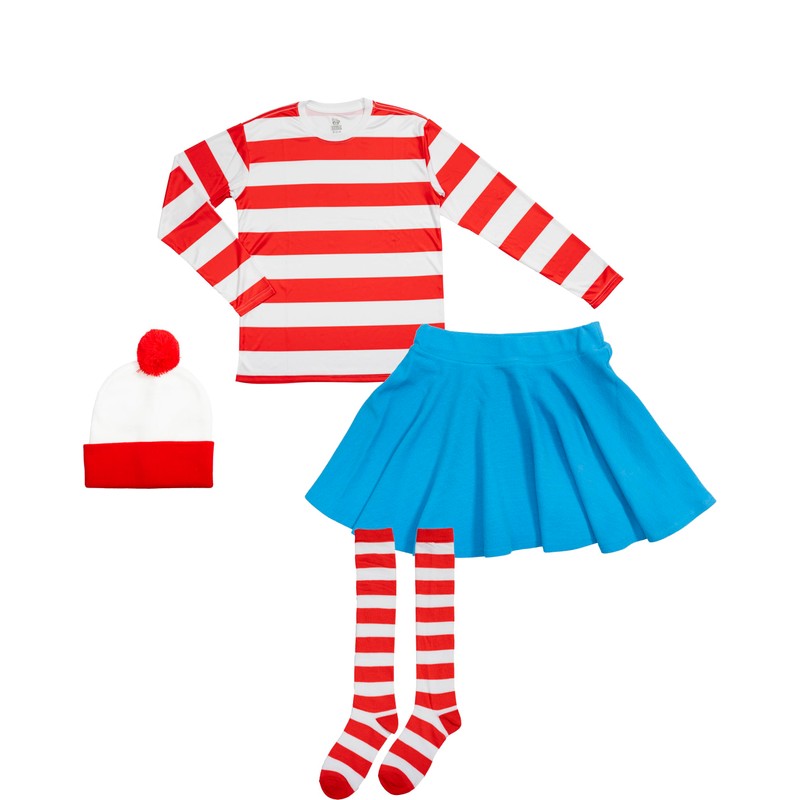 - Dress up with a Classic Waldo Halloween Costume set that includes 1 red and white striped long-sleeved T-shirt, skirt, socks, and a hat to effortlessly recreate the look. This officially licensed costume brings a look that comes straight from the book. Suitable for most adults and used in Halloween costume activities.