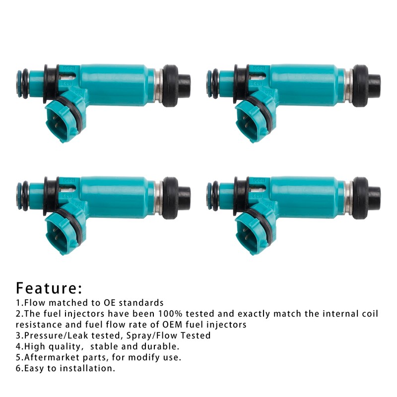 - Feature: ;1.Flow matched to OE standards;2.The fuel injectors have been tested and exactly match the internal coil resistance and fuel flow rate of OEM fuel injectors