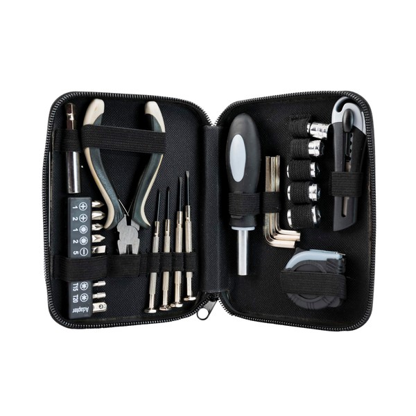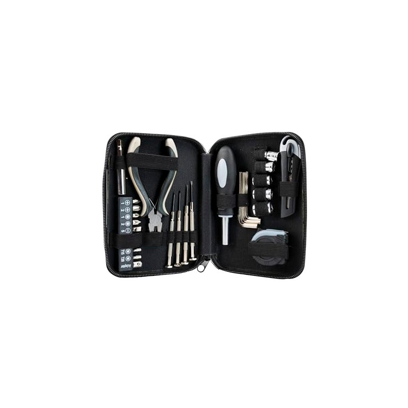 • Outfitted with 27 essential tools to tackle repairs big or small, this kit includes sockets, screwdriver heads, pliers, hex keys, a utility knife, and a tape measure, bundled in an easy to store zippered case for ultimate accessibility.