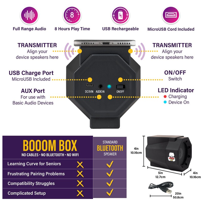 Upgrade your phone experience with Booom Box - the ultimate solution for crystal-clear hands-free amplified smartphone audio. Booom Box isn't just another Bluetooth speaker. In fact, it doesn’t use Bluetooth pairing or cables at all! It's a versatile device designed to boost the volume of your phone 10X when listening to music, videos, podcasts, audiobooks, and using speakerphone to take calls. NO Cables! NO Bluetooth pairing! NO Wifi! Just great sound! The easiest way to boost your smartphone’s audio! No more tangled wires or frustrating Bluetooth pairing processes. Booom Box utilizes induction technology, allowing you to amplify your phone's volume effortlessly. Simply place your smartphone on top, and experience exceptional 10X amplified sound. This innovation benefits everyone, including those who prefer a Bluetooth-free solution, seniors, and individuals with hearing impairments. Seniors can enjoy improved phone conversations without straining to hear, while tech-adverse users will appreciate the simplified easy-touch activation. Just set your smartphone on top and press play on your media and/or answer calls on speakerphone. Compatible with all smartphone devices with a working internal speaker. The perfect companion for music enthusiasts, video streamers, podcast lovers, audiobook listeners, avid speakerphone users, and anyone who values clear, amplified audio without the need for complicated Bluetooth pairing or messy cables. Embrace the future of hands-free communication and experience the convenience of Booom Box now.